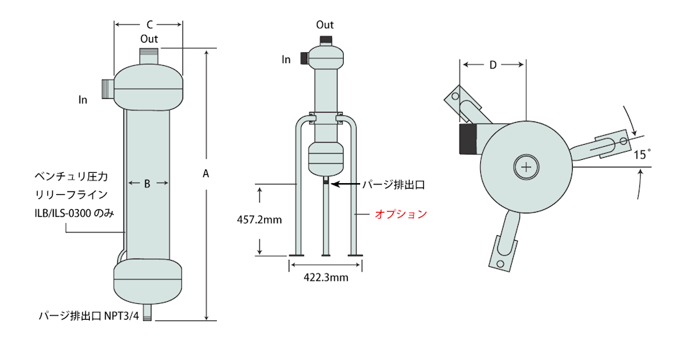■ ラコス遠心分離セパレーター・ILB/ILS サイズ表(ネジ部NPT⇨PT<R>変換アダプタ付き)
