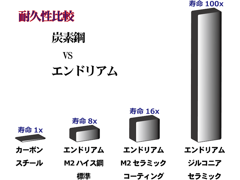長年培った生産技術で実現した、高品質・低コストのエンドリアム・レザー刃をご使用いただければ交換頻度も少なくなり、貴社生産工程の合理化にもお役に立てます。ENDURIUM®-エンドリアムとは… ハイス鋼/ジルコニアセラミック製の高性能レザー刃