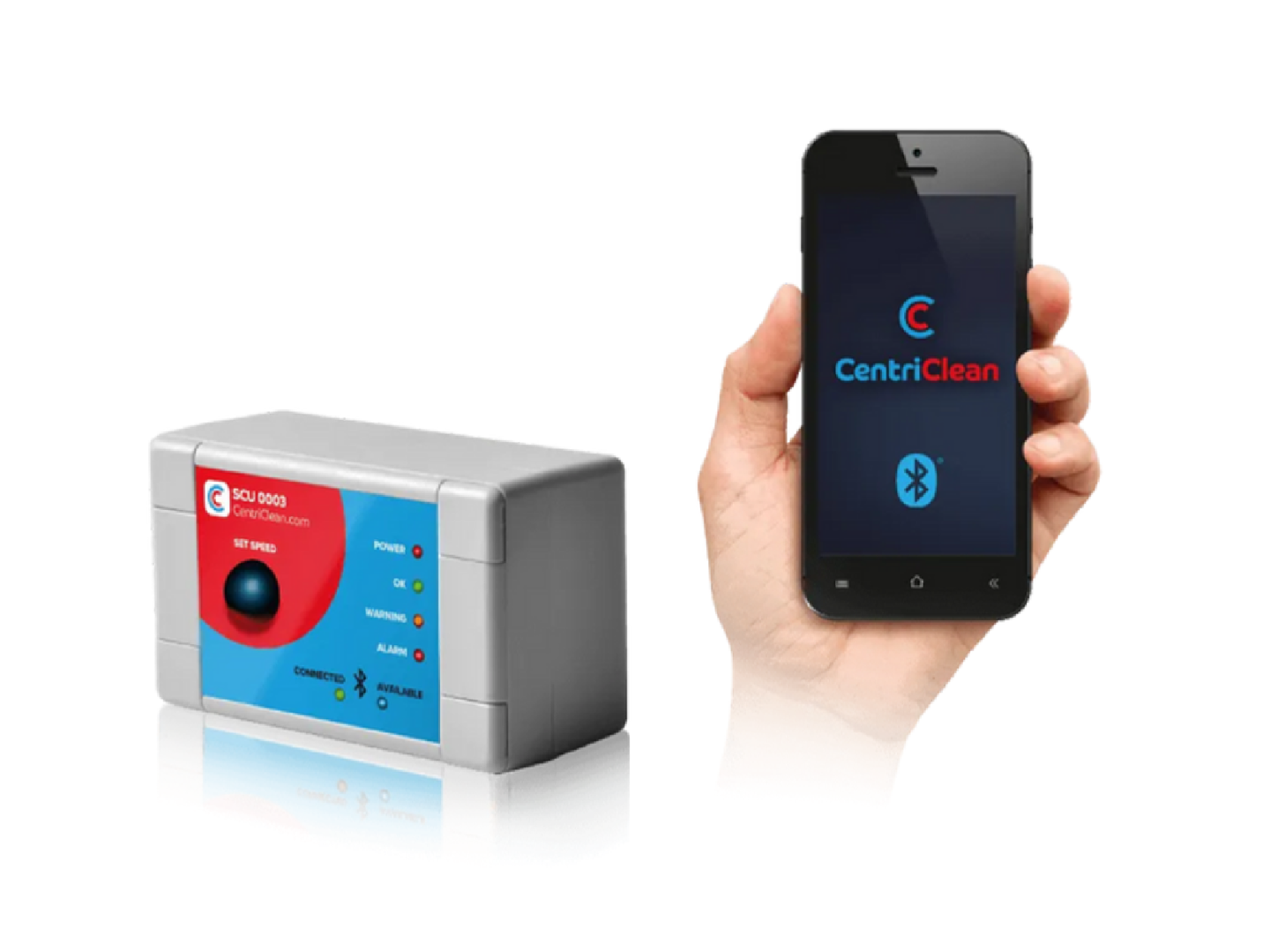 SCU 0003 は、Bluetooth®️経由でスマートフォンやタブレットなどの携帯デバイス上のデータアクセスに最適です。専用アプリ(CentriClean)が用意されており、性能を監視するように設計されています。通常の動作中は、回転速度を継続的に表示し、稼働時間を監視します。