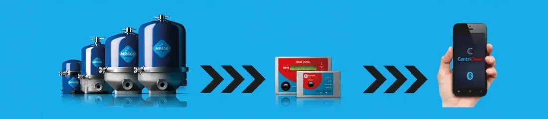 SCU 0003 は、Bluetooth®️経由でスマートフォンやタブレットなどの携帯デバイス上のデータアクセスに最適です。専用アプリ(CentriClean)が用意されており、性能を監視するように設計されています。通常の動作中は、回転速度を継続的に表示し、稼働時間を監視します。